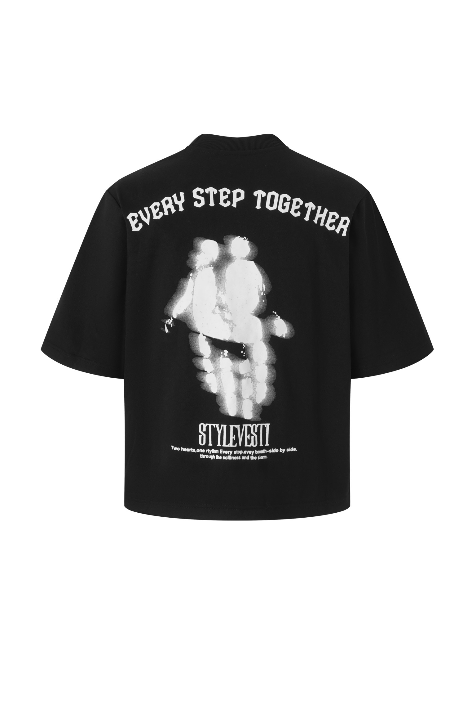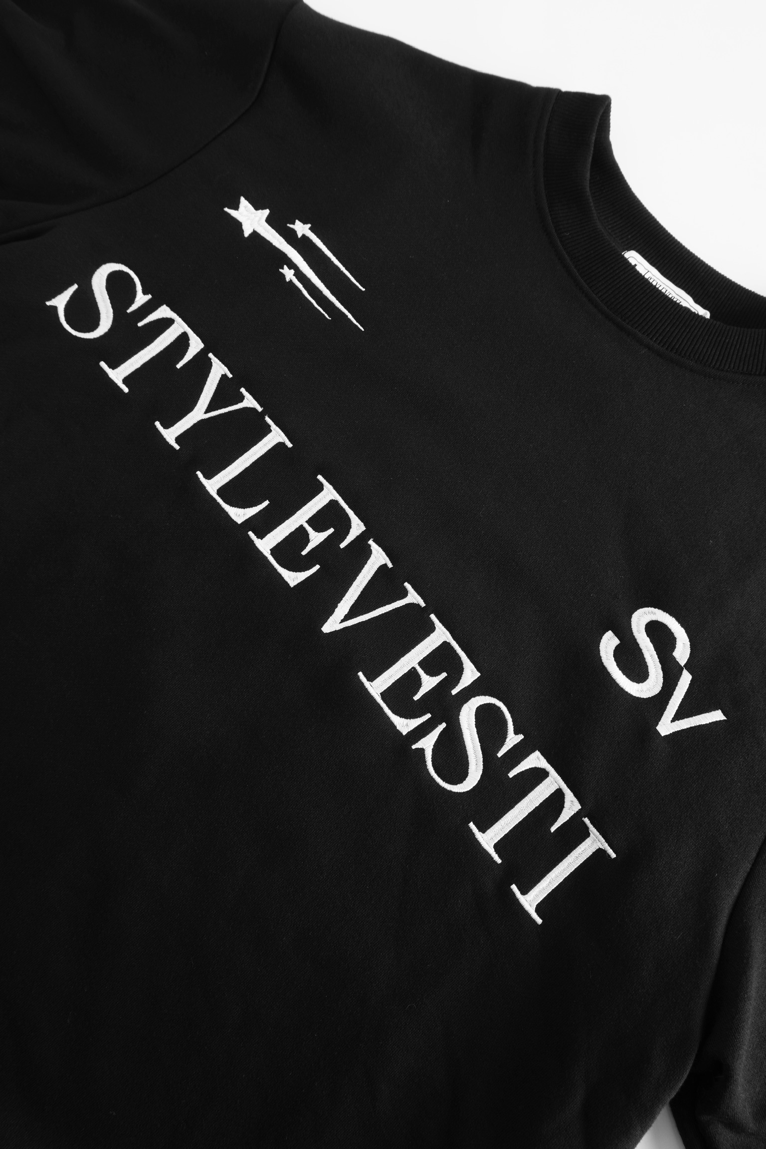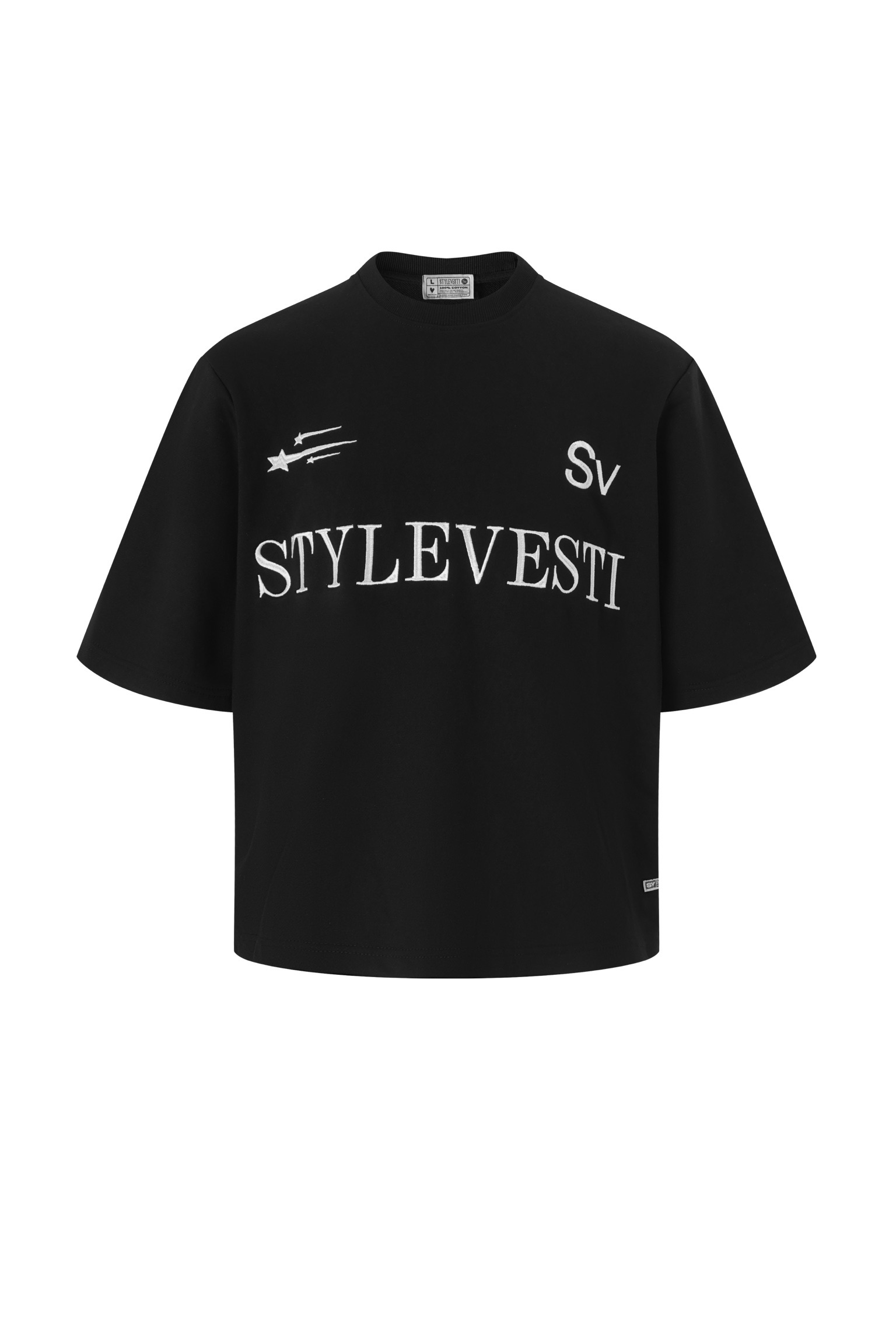 A premium oversized baggy denim-texture T-shirt crafted from thick cotton with embroidered chest detail, DTG full-color back print, and StyleVesti’s signature “SV” woven patch. Unisex, black, available in M–XL. Elevated streetwear with conscious design.